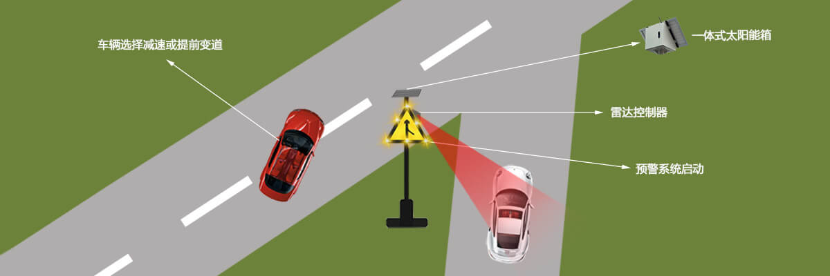 -预警系统启动后,发光标志牌开始闪烁,预警公路上的车辆前方匝道口即将有车辆交汇,司机可选择减速或者提前变道,避免发生交通事故