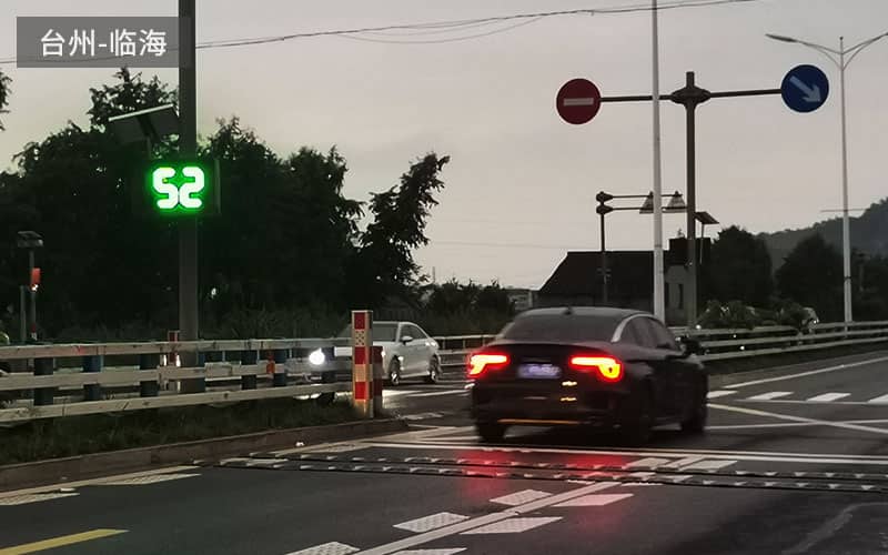 -当雷达检测到未超速车辆时,面板实时显示车辆的实际速度;当检测到超速车辆时,实时显示车辆的实际速度,4个黄灯闪烁并显示黄色“超速”文本警示司机。