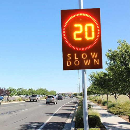 1.LED雷达限速标志,也被命名为速度警告标志或多种速度限制标志,是为了提高道路安全和鼓励更安全的驾驶速度而设计。超速时,雷达面板显示“SLOW DOWN" , 提醒司机减速慢行 , 注意安全驾驶