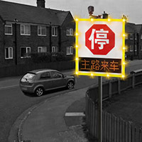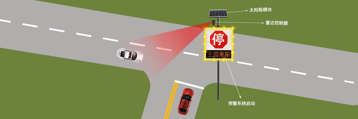 -预警系统启动后,发光标志牌开始闪烁,预警支路上的车辆前方交汇处即将有车辆交汇,请主动减速并停车让行,避免发生交通事故