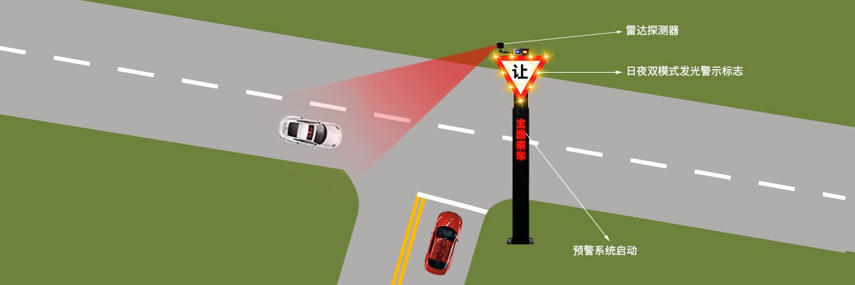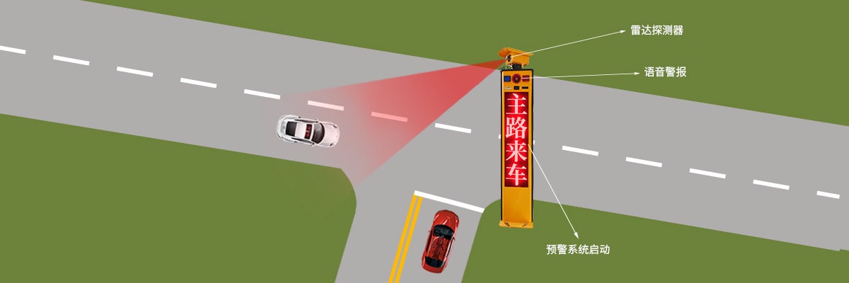 -雷达探测器全天候监测主路方向来车,一旦有主路来车进入监测区域,实时激活预警系统启动
