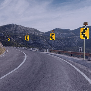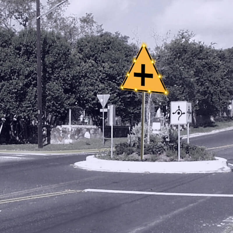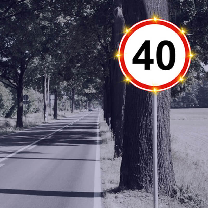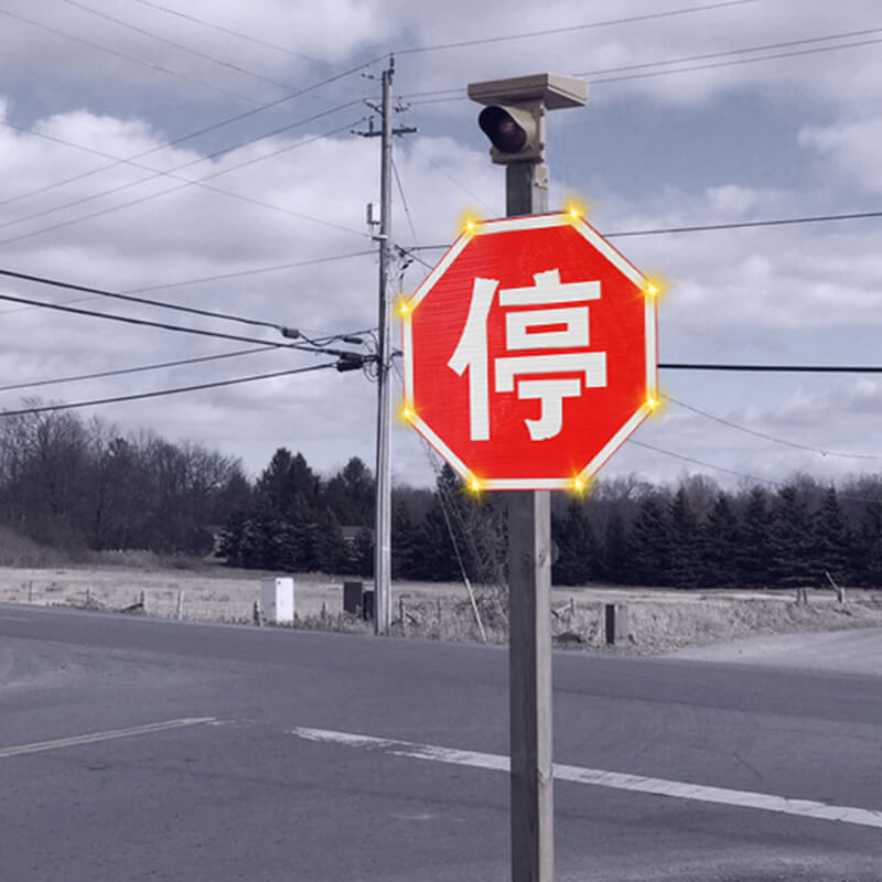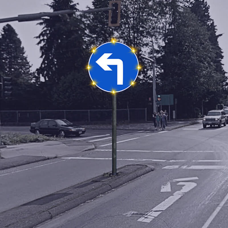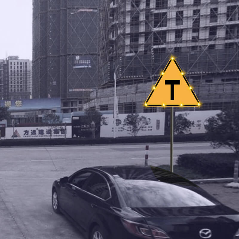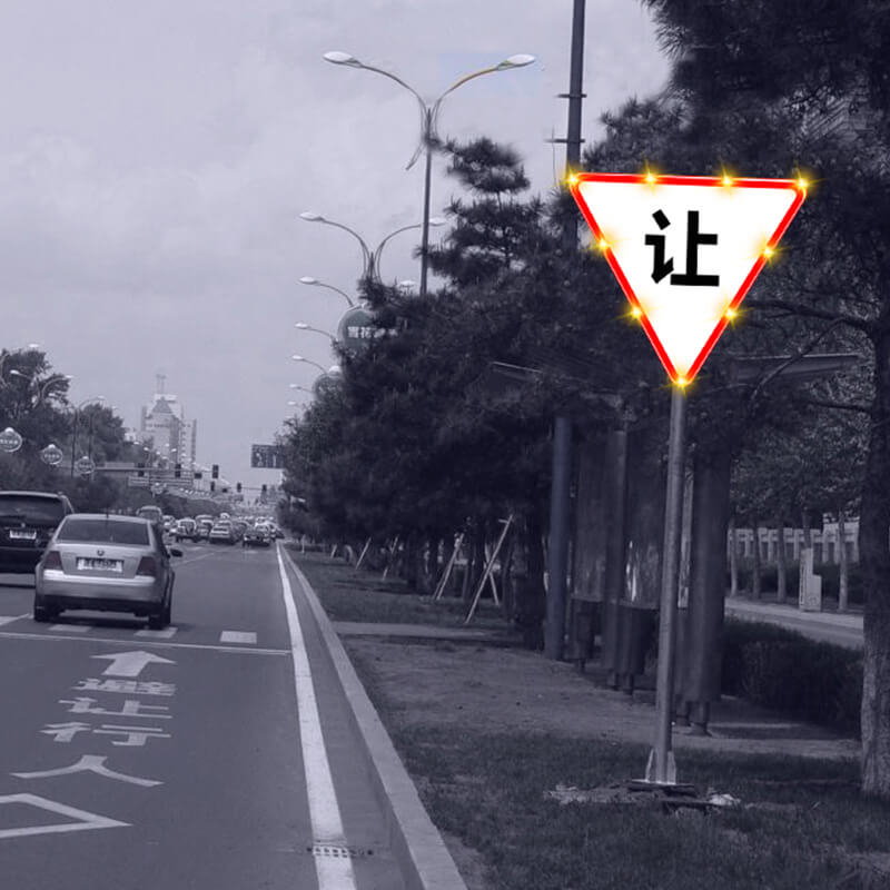 点发光交通标志采用日间可见式LED灯源和反光膜材料制作版面,实现交通标志自发光效果,克服传统反光膜交通标志在昏暗环境下视认效果不佳的严重缺陷。LED同步闪烁还可以有效提高司机的行车安全意识,减少事故的发生。